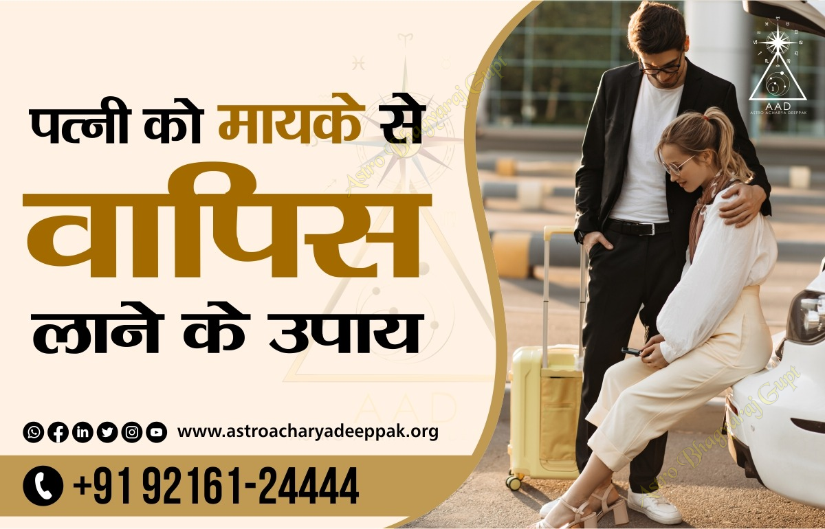 यदि पत्नी को मायके से वापिस लाना चाहते हो तो हमसे संपर्क करके ज्योतिष उपाय/टोटके और रूठी हुई स्त्री का वशीकरण मन्त्र का प्रयोग कर अपनी पत्नी को वापस मायके से बुला सकते हो| यदि आपकी पत्नी आपसे प्रेम नहीं करती है तो आकर्षित वशीकरण का प्रयोग कर अपनी पत्नी को अपने काबू में किया जा सकता है | बहुत सरे ज्योतिष तंत्र विद्या का प्रयोग कर आप अपनी पत्नी को वापस अपनी बाँहों में भर सकते है | यदि अपनी पत्नी को मनाना चाहते हो और वापिस प्यार पाना चाहते हो तो एक्सपर्ट गुरु जी से सहायता प्राप्त कर अपने जीवन में प्यार/प्रेम भर सकते है |