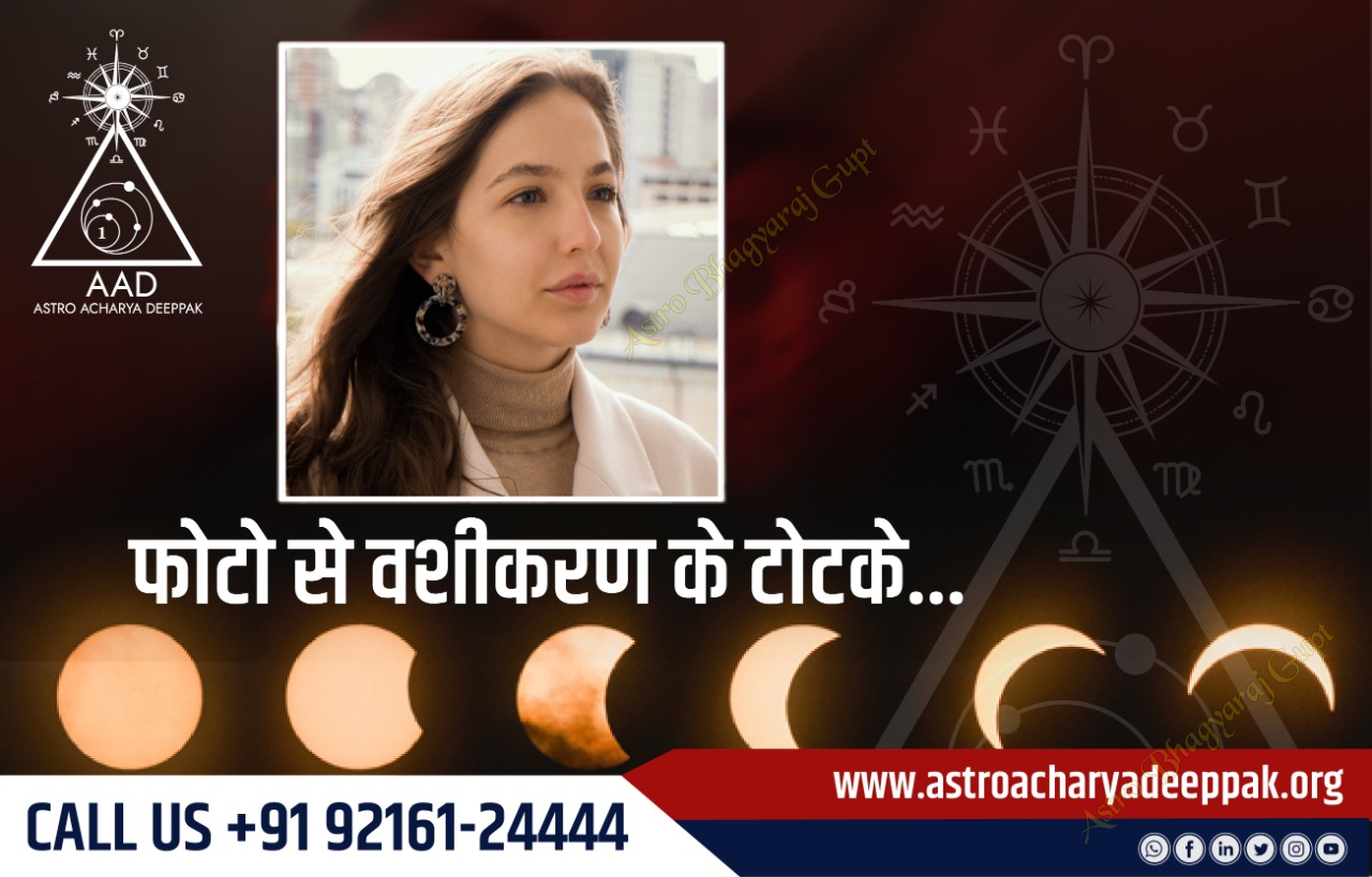किसी भी व्यक्ति के ऊपर आप फोटो द्वारा वशीकरण मंत्र का प्रयोग कर अपना प्रभाव डाल सकते है अगर वह उपस्थित नही है तो आप उसकी फोटो/तस्वीर से उसे वश में किया जा सकता है| फोटो द्वारा वशीकरण मंत्र आपको मौका देता है कि आप दूर से ही किसी व्यक्ति पर अपने वशीकरण का प्रभाव डाल सकें| फोटो द्वारा वशीकरण मंत्र के बहुत ही चमत्कारिक असर होते हैं, इसलिए आपको ये सलाह दी जाती है फोटो द्वारा वशीकरण मंत्र का प्रयोग करते हुए इसे लोगों से छुपा कर करें| इस संबंध में गौर करने वाली बात ये है कि आप फोटो द्वारा जिस भी व्यक्ति का वशीकरण करना चाहिए उसे भी इस बात की खबर नही होनी चाहिए| दूर स्थित किसी भी व्यक्ति को उसकी फोटो के प्रयोग से वश में किया जा सकता है लेकिन उसे इस बारे में जानकारी नही होनी चाहिए|
