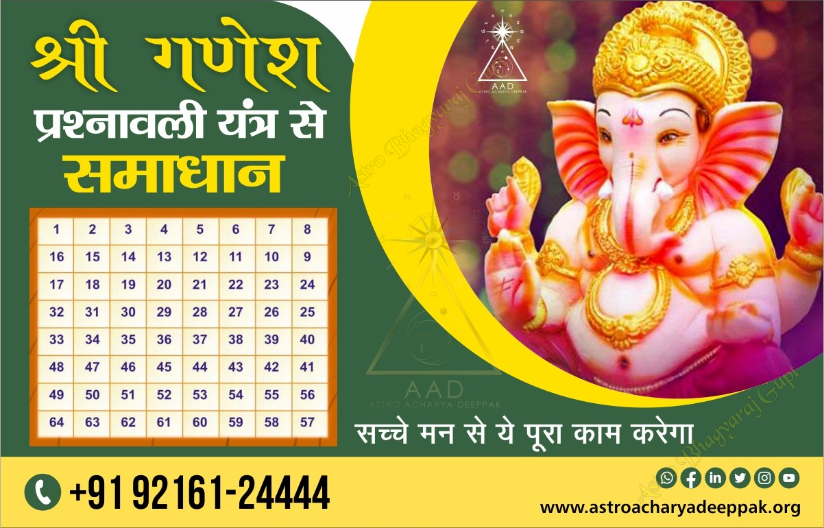 हिंदू धर्म में भगवान श्रीगणेश को प्रथम पूज्य माना गया है अर्थात सभी मांगलिक कार्यों में सबसे पहले श्रीगणेश की ही पूजा की जाती है। श्रीगणेश की पूजा के बिना कोई भी शुभ कार्य नहीं किया जाता। श्रीगणेश प्रश्नावली यंत्र के माध्यम से आप अपने जीवन की परेशानियों व सवालों का हल आसानी से पा सकते हैं। यह बहुत ही चमत्कारी यंत्र है।