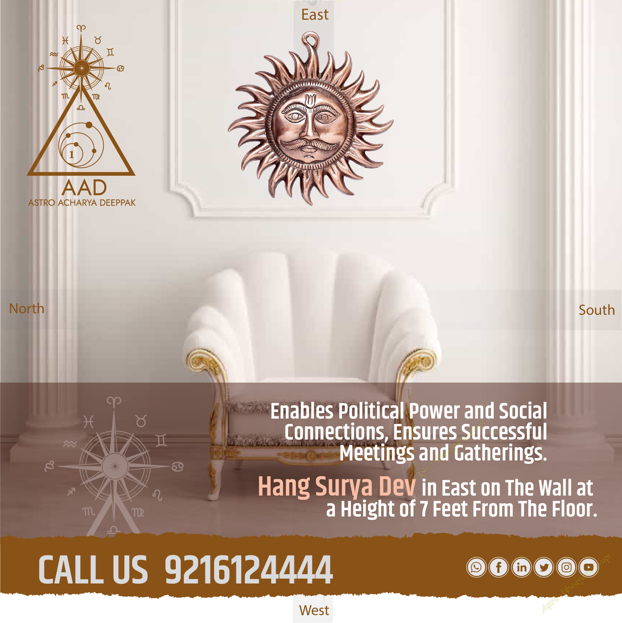 Placing a representation of Surya Dev (the Sun God) on the east-facing wall at a height of seven feet is a common practice rooted in Vastu Shastra, the traditional Indian system of architecture.