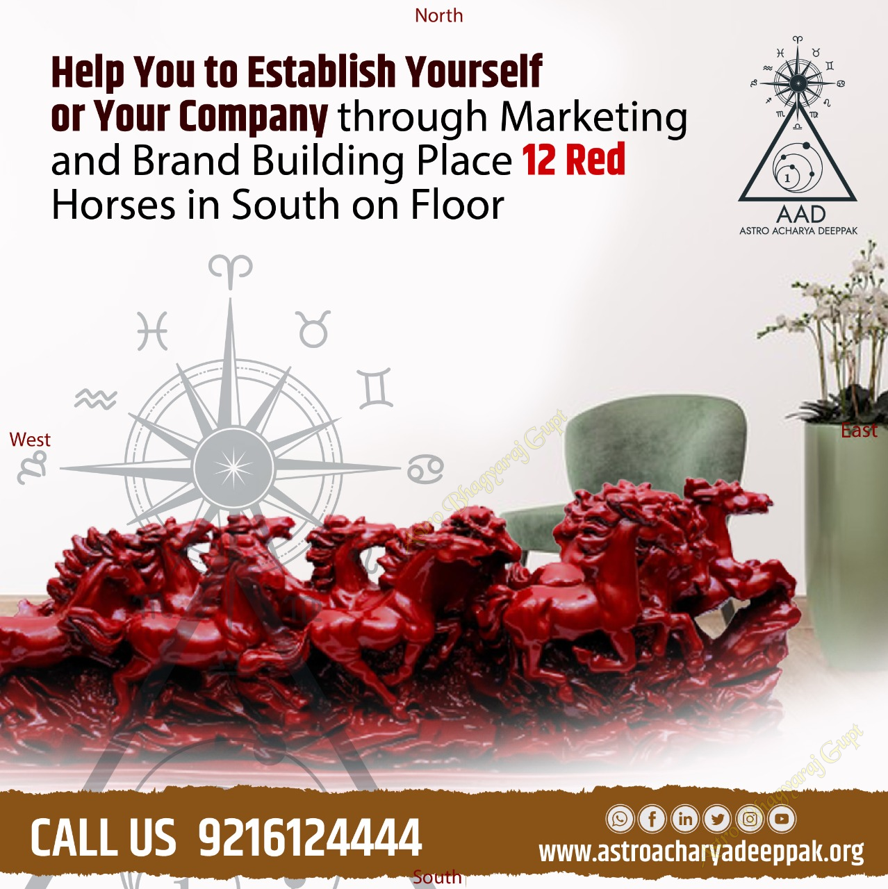 Placing 12 red horses in the south on the floor is a Vastu remedy believed to enhance marketing and brand building efforts. According to Vastu Shastra, horses symbolize power, success, and progress, while the color red represents energy and passion. Positioning them in the south, the direction associated with fire and fame, is thought to ignite your brand's visibility and attract recognition. This arrangement is believed to create a dynamic and positive environment, fostering growth and establishing a strong presence in the marketplace.