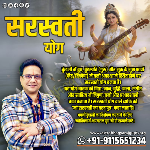 जब कुंडली में बुध, बृहस्पति (गुरु) और शुक्र जैसे शुभ ग्रह केंद्र (1, 4, 7, 10) या त्रिकोण (1, 5, 9) भावों में बलवान अवस्था में स्थित होते हैं, तब सरस्वती योग का निर्माण होता है। यह योग अत्यंत दुर्लभ और शुभ माना जाता है।
