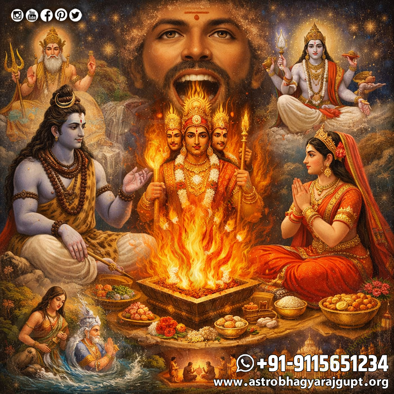 Agni is the only medium through which the sacred offerings (Havishya) reach the gods. When we lovingly offer oblations into the fire while chanting “Swaha,” they directly reach the mouth of Lord Vishnu, thereby satisfying Brahma, Vishnu, and Mahesh.