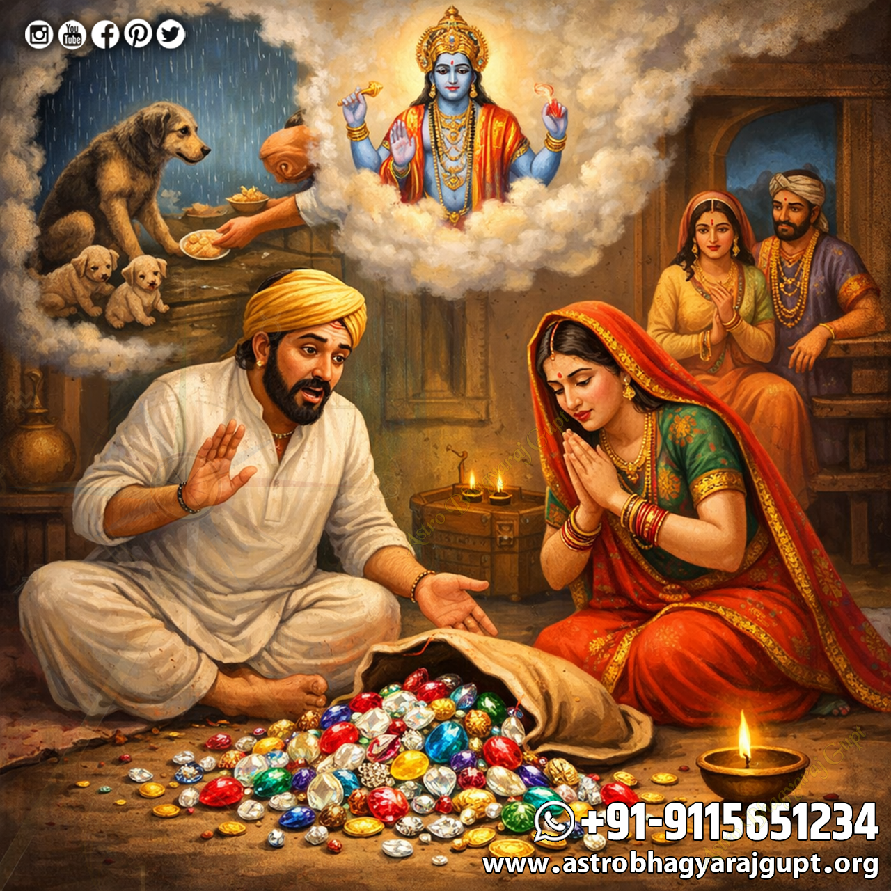 The rich man’s wife was very virtuous and spiritually wise. She meditated and realized that the merchant had fed a hungry dog earlier that day. She told her husband to buy the good deed he earned by feeding the animal, because it was the greatest deed he had performed.