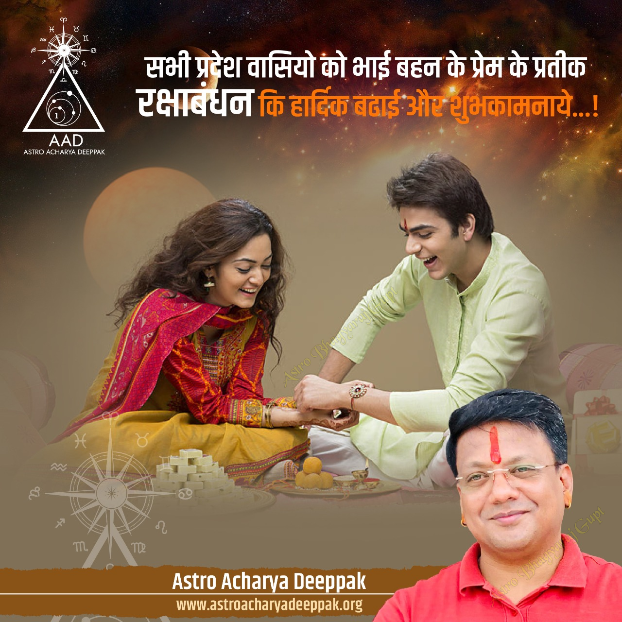 Heartfelt greetings for Raksha Bandhan to everyone from Astro Bhagyaraj Gupt, wishing that this cherished festival fills your lives with immense joy, prosperity, and deep affection, and may the sacred and unbreakable bond between brothers and sisters endure eternally; on this auspicious day, sisters lovingly tie the Rakhi, a holy thread symbolizing their affection and seeking a promise of protection, while brothers, in turn, pledge to safeguard their sisters from all adversities, thus reinforcing the profound love, unity, and togetherness that this beautiful festival embodies within families.