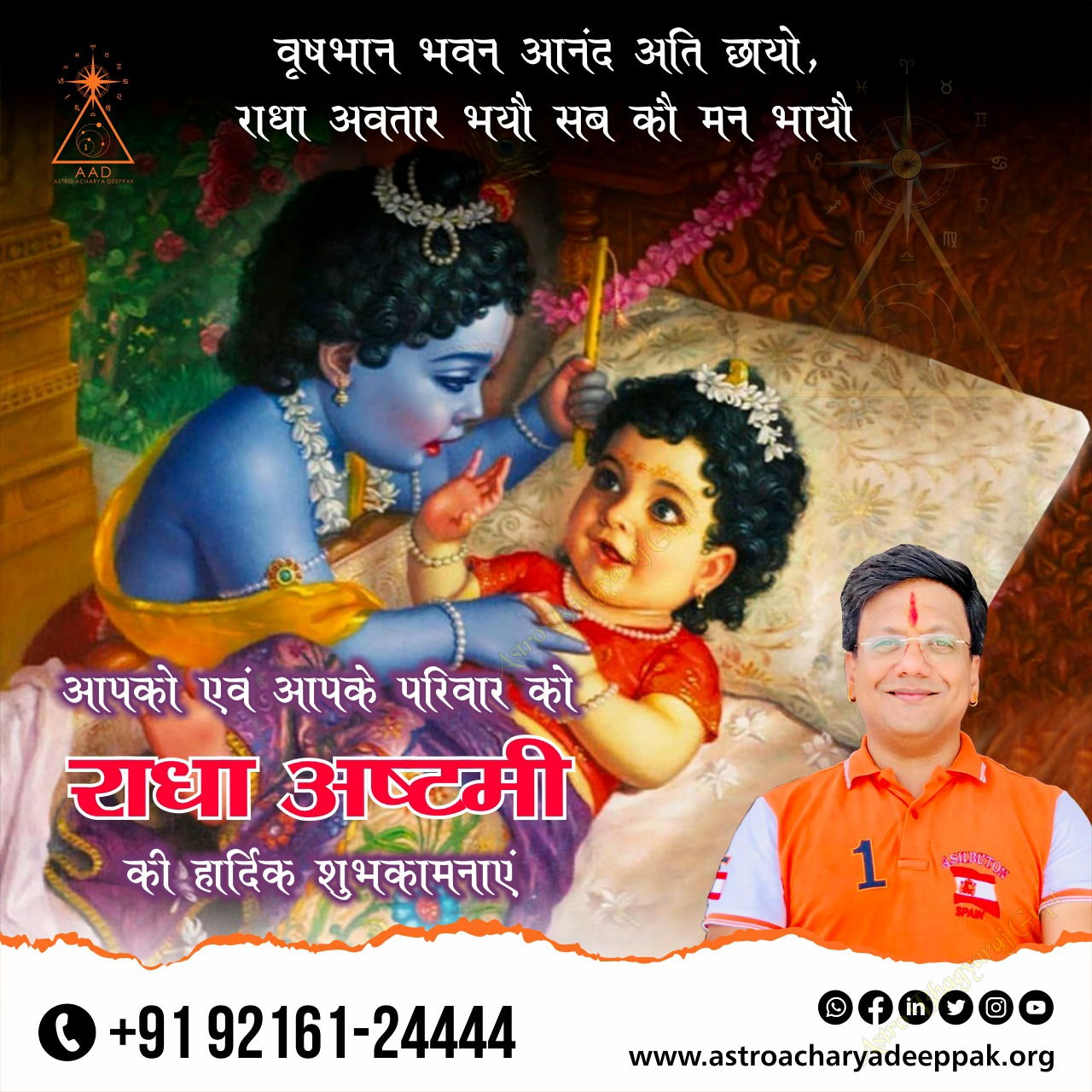 ज्योतिषाचार्य भाग्यराज गुप्त की ओर से राधा अष्टमी की हार्दिक शुभकामनाएं राधा अष्टमी के इस पावन अवसर पर, ज्योतिषाचार्य भाग्यराज गुप्त सभी को अपनी हार्दिक शुभकामनाएं देते हैं। राधा रानी के दिव्य आशीर्वाद से आपका जीवन प्रेम, खुशी और समृद्धि से भर जाए। आइए हम राधा और कृष्ण के बीच के शाश्वत प्रेम का जश्न मनाएं और एक सद्भावपूर्ण और पूर्ण जीवन के लिए उनके आशीर्वाद मांगें।