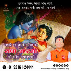 On this auspicious occasion of Radha Ashtami, Astro Bhagyaraj Gupt extends his warmest wishes to everyone. May the divine blessings of Radha Rani fill your life with love, happiness, and prosperity. Let us celebrate the eternal love between Radha and Krishna and seek their blessings for a harmonious and fulfilling life.