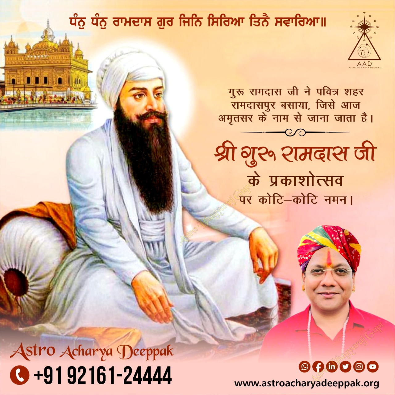 श्री गुरु रामदास जी के प्रकाश पर्व की हार्दिक शुभकामनाएं ज्योतिषाचार्य भाग्यराज गुप्त की ओर से आप सभी को श्री गुरु रामदास जी के प्रकाश पर्व की हार्दिक शुभकामनाएं।" चौथे गुरु, श्री गुरु रामदास जी का प्रकाश पर्व सिख धर्म के लिए एक पवित्र अवसर है। गुरु रामदास जी ने सिख धर्म को नई ऊंचाइयों पर पहुंचाया और मानव सेवा के लिए अनेक कार्य किए। उन्होंने अमृतसर शहर की स्थापना की और स्वर्ण मंदिर का निर्माण करवाया। आज के इस पावन अवसर पर, आइए हम सभी गुरु रामदास जी को नमन करें और उनके बताए हुए मार्ग पर चलने का संकल्प लें। गुरु जी ने हमें सेवा, संगत और सिमरन का मार्ग दिखाया है। आइए हम सभी उनके बताए हुए मार्ग पर चलकर एक बेहतर समाज का निर्माण करें।