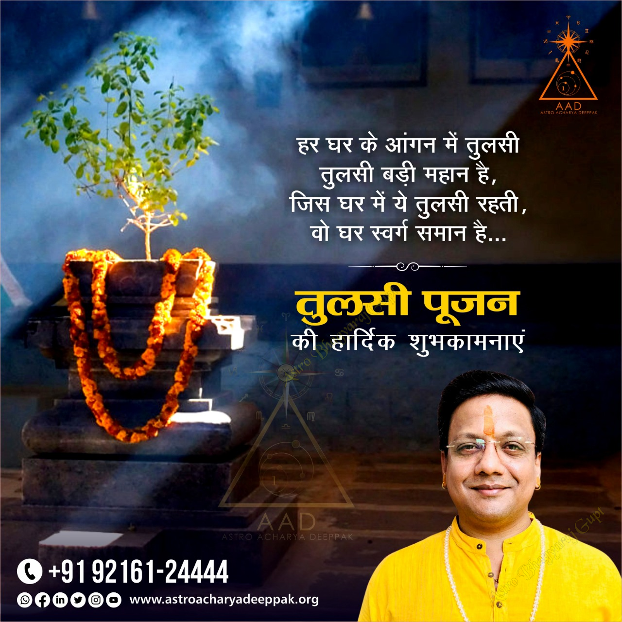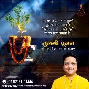 Heartiest greetings for Tulsi Pujan to all of you from Jyotishacharya Bhagyaraj Gupt. Tulsi Pujan is a sacred Hindu festival that symbolizes the purity and importance of the Tulsi plant. Tulsi is considered a form of Mother Lakshmi, and it is believed to possess divine properties. On this auspicious occasion, let us all worship Tulsi Mata together and receive her blessings. Tulsi Pujan inspires us to have respect and reverence for nature. This festival reminds us that we should keep our surrounding environment clean and green. On this holy occasion of Tulsi Pujan, I wish that happiness, peace, and prosperity remain in your life.