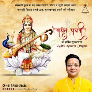 Astro Bhagyaraj Gupt extends warm Basant Panchami wishes to everyone. This auspicious festival, dedicated to Goddess Saraswati, the deity of knowledge, music, arts, wisdom, and learning, marks the arrival of spring and signifies new beginnings. It's a time to seek blessings for academic success, artistic inspiration, and overall intellectual growth. Devotees often adorn themselves in yellow, the color associated with the goddess, and offer prayers for enlightenment and wisdom. Basant Panchami is also a propitious time for starting new ventures and embracing positive change. May this vibrant festival fill your lives with knowledge, creativity, and prosperity.
