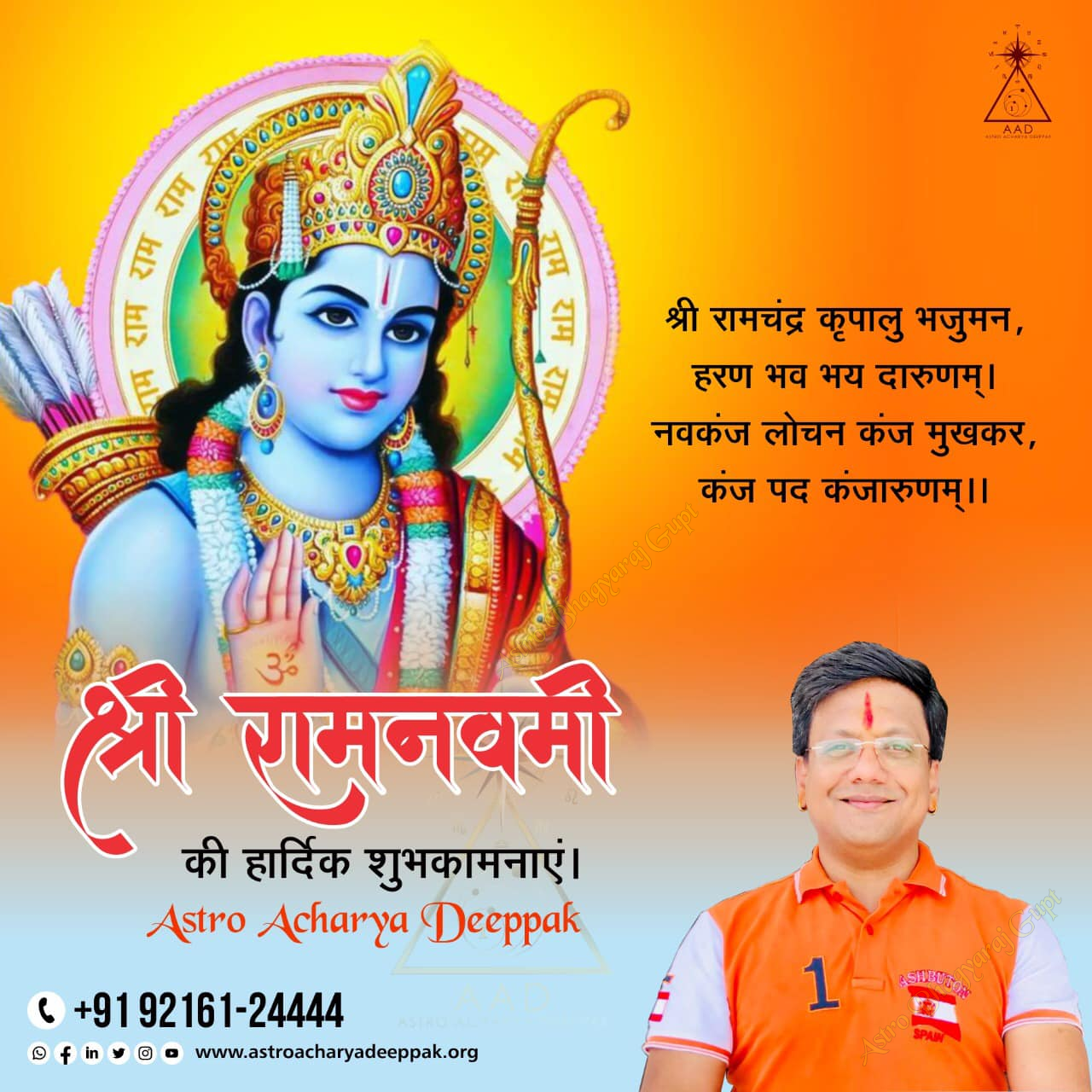 On this auspicious occasion of Ram Navami, as the world celebrates the birth of Lord Rama, Astrologer Bhagyaraj Gupt heartfelt greetings to everyone. Lord Rama is the epitome of truth, justice, and righteousness. We should take inspiration from his life and always follow the path of truth in our lives. Let us all come together to celebrate this holy festival and make our lives successful with the blessings of Lord Rama.