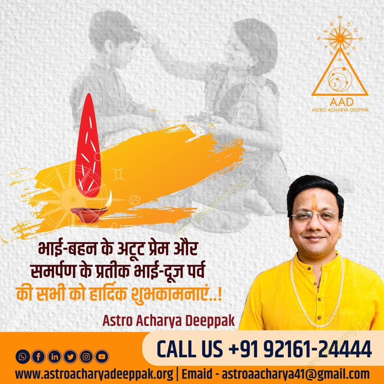 Happy Bhai Dooj. Astro Bhagyaraj Gupt extends warm and heartfelt wishes for a joyous Bhai Dooj. May this sacred festival strengthen the bond between brothers and sisters, filling your lives with love, prosperity, and happiness. As we celebrate this auspicious occasion, let us cherish the beautiful relationship that brings us together. May the blessings of Bhai Dooj illuminate your path with success and well-being. Wishing you and your family a blessed and fulfilling celebration.