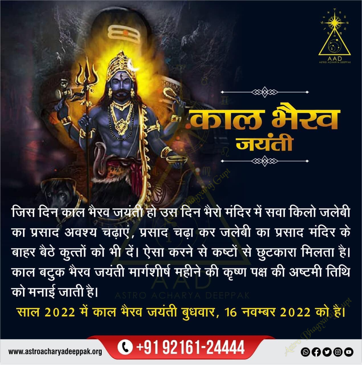🚩 Kal Bhairav Jayanti, an auspicious day dedicated to Lord Kal Bhairav, a fierce manifestation of Lord Shiva, is observed with great reverence by devotees. This day, typically falling on the Krishna Paksha Ashtami (eighth day of the waning moon) in the Hindu month of Kartik, is marked by special pujas, prayers, and rituals. Devotees believe that worshipping Lord Kal Bhairav on this day helps to ward off negative energies, overcome obstacles, and attain spiritual prosperity. Known as the protector of temples and the guardian of time, Kal Bhairav is invoked for blessings of courage, strength, and divine protection. Temples dedicated to Kal Bhairav see a surge in devotees offering prayers, especially at night, as it is believed that his powers are most potent during this time. The observance of Kal Bhairav Jayanti is a reminder of the divine power that destroys evil and upholds righteousness.