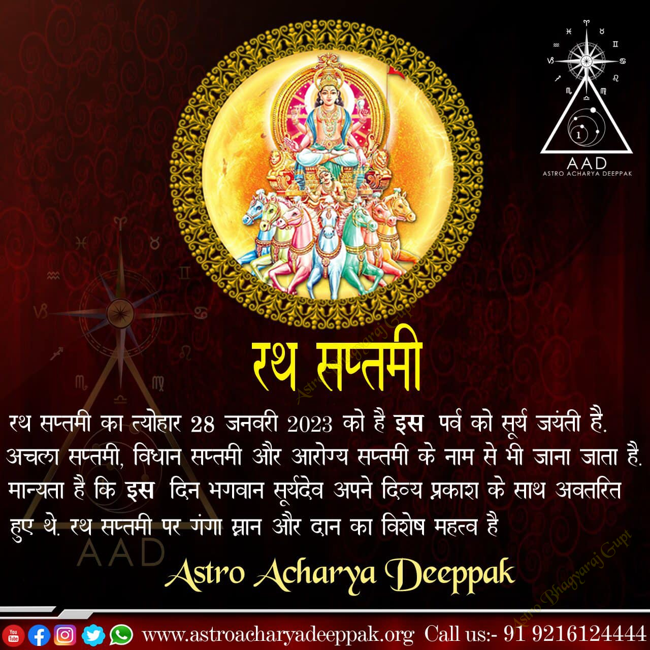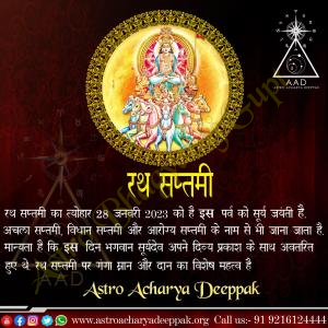 Astro Bhagyaraj Gupt extends warm wishes for a blessed Ratha Saptami. This auspicious day, dedicated to Surya Dev, marks the sun's northward journey and the onset of warmer days. May the 🙏🏻🚩divine energy of the Sun God illuminate your life with health, prosperity, and happiness. Let this Ratha Saptami bring new beginnings and fill your days with radiant positivity. We hope you and your loved ones experience the divine blessings of Surya Bhagwan.