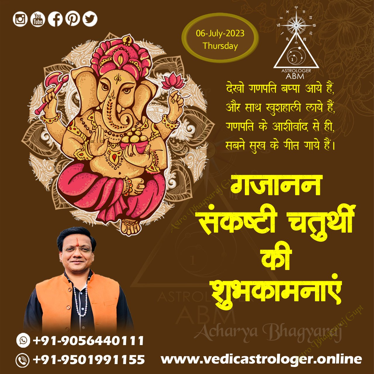 Gajanan Sankshti Astro Bhagyaraj Gupt extends heartfelt wishes to all devotees on the auspicious occasion of Gajanan Sankashti Chaturthi. This sacred day, dedicated to Lord Ganesha, is a time for reflection, prayer, and seeking blessings for overcoming obstacles. May the divine grace of Lord Ganesha illuminate your path, remove all hindrances, and bestow you with success, peace, and prosperity. We encourage you to observe this day with devotion and seek the blessings of the remover of obstacles.