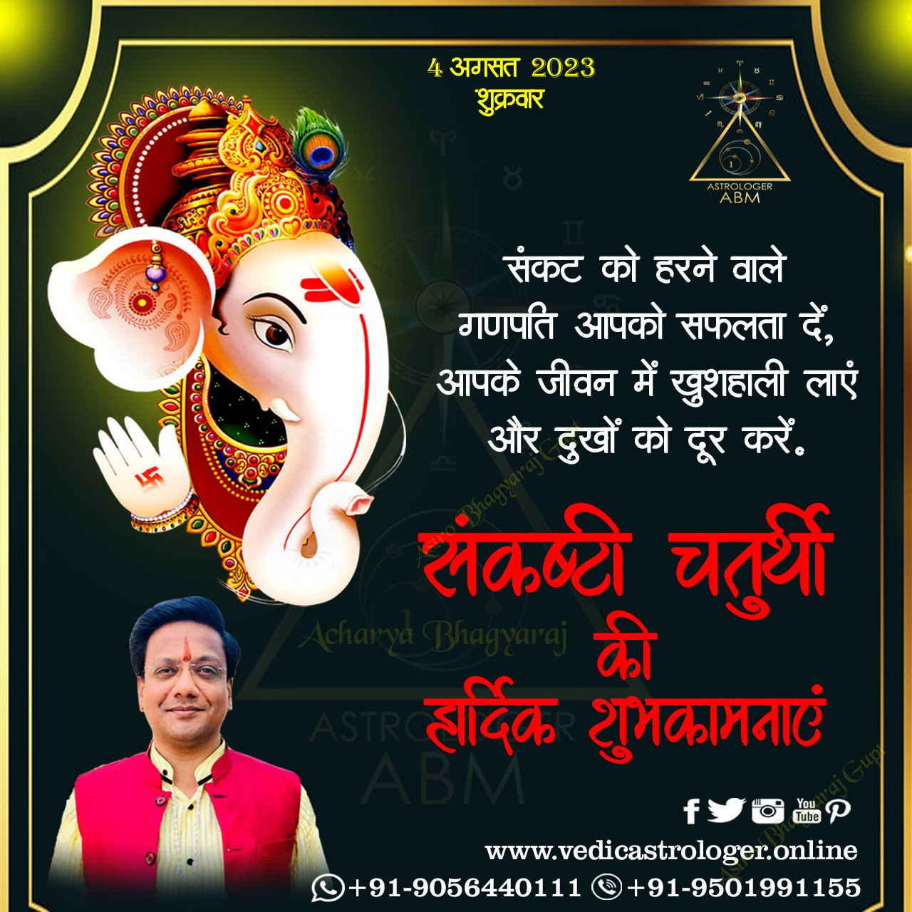 Astro Bhagyaraj Gupt extends warm wishes to everyone on the auspicious occasion of Sankashti Chaturthi. May Lord Ganesha remove all obstacles from your life and bless you with prosperity, happiness, and success. On this sacred day, we pray for peace and well-being for all. Let the divine blessings of Lord Ganesha illuminate your path and bring you closer to your goals. We encourage you to embrace the spiritual significance of this day and seek the blessings of the Vighnaharta.