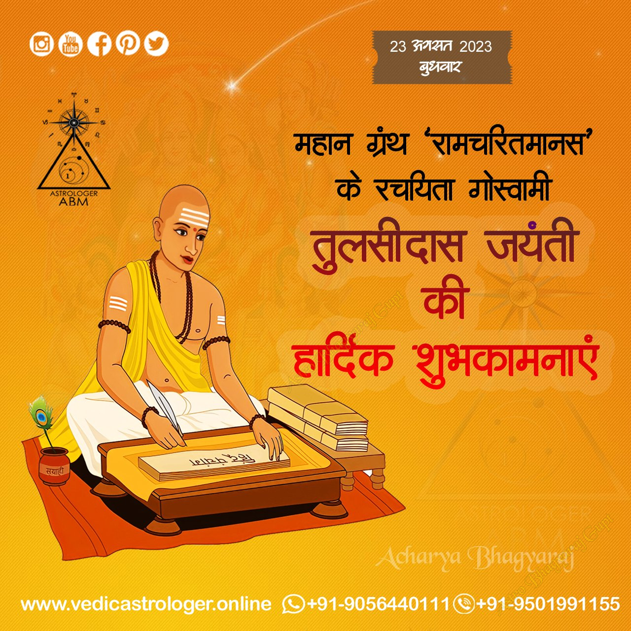 तुलसीदास जयंती के पावन अवसर पर, ज्योतिषाचार्य भाग्यराज गुप्त सभी को हार्दिक शुभकामनाएं देते हैं। गोस्वामी तुलसीदास, श्रद्धेय कवि और संत, ने हमें कालजयी महाकाव्य रामचरितमानस प्रदान किया, जो ज्ञान और भक्ति का प्रतीक है। उनकी शिक्षाएँ हमें धर्म, करुणा और अटूट विश्वास का जीवन जीने के लिए प्रेरित करें। आइए हम उनकी विरासत का जश्न मनाएं और शांति और समृद्धि के लिए उनका आशीर्वाद लें।