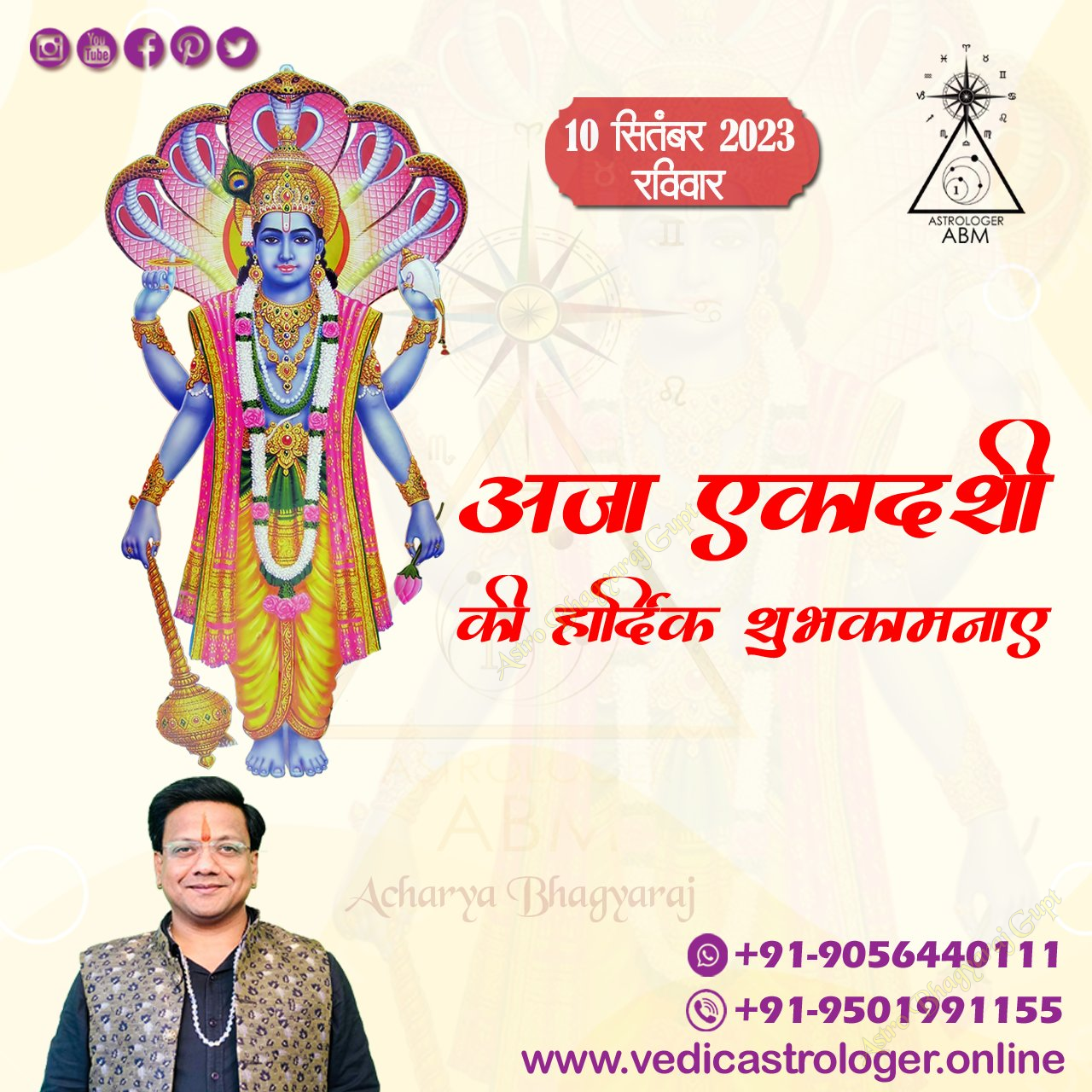 Aja Ekadashi, a sacred day dedicated to Lord Vishnu, is a time for spiritual reflection and purification. Astro Bhagyaraj Gupt extends heartfelt wishes for a blessed Aja Ekadashi. May this day bring you immense peace, prosperity, and the fulfillment of your righteous desires. Observing this fast with devotion is believed to absolve one of past sins and pave the way for a virtuous life. Let us all immerse ourselves in the divine grace of Lord Vishnu and seek his blessings for a harmonious and prosperous future.