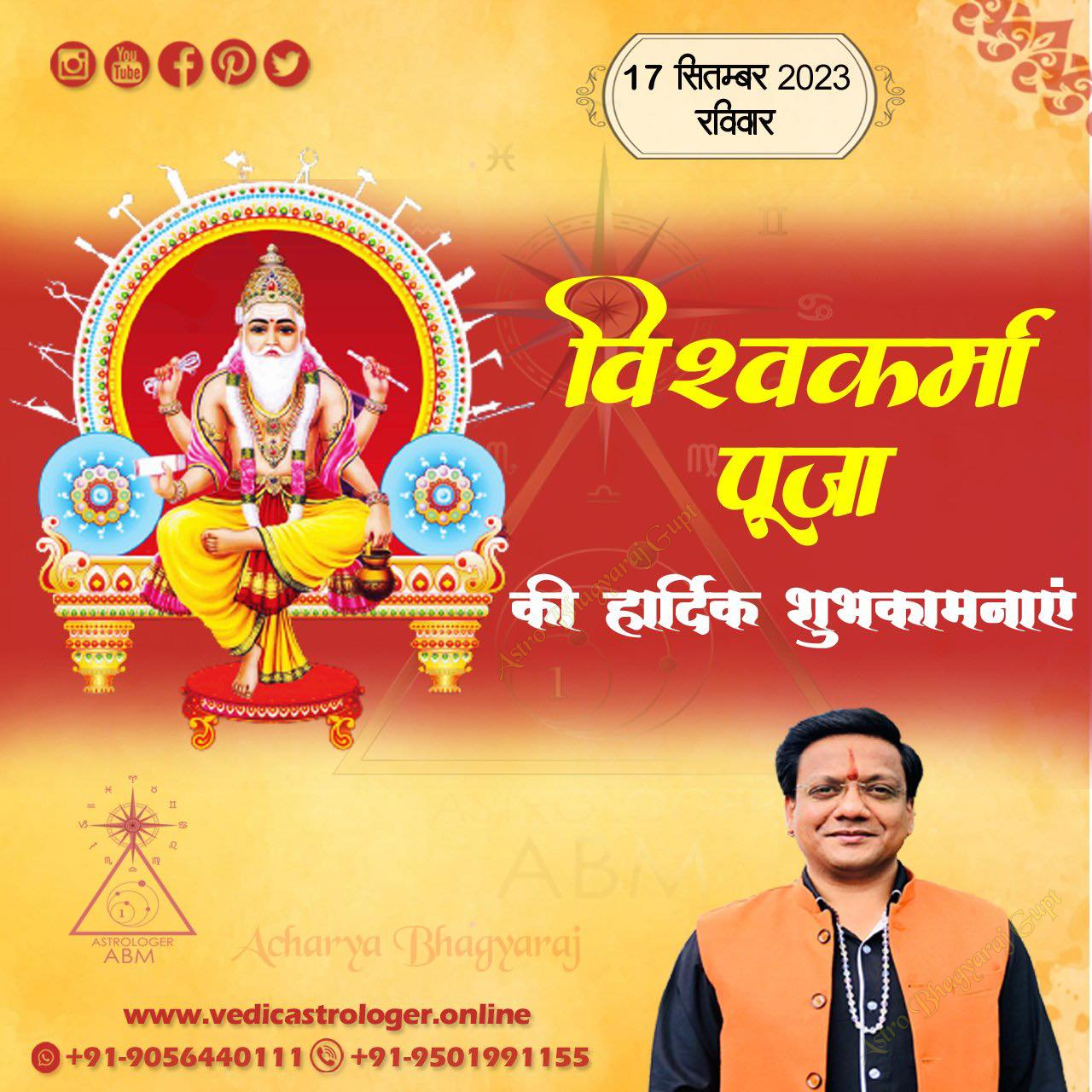 Astro Bhagyaraj Gupt extends warm wishes to you all on the auspicious occasion of Vishwakarma Puja. Lord Vishwakarma, revered as the universe's first architect, craftsman, and engineer, is worshipped on Vishwakarma Jayanti for wish fulfillment and career advancement, with devotees cleaning and honoring their tools, machines, and vehicles to ensure their smooth functioning and prevent disruptions in work and business; credited with creating divine objects like Shiva's Trishul and Vishnu's Sudarshan Chakra, as well as mythical cities, Lord Vishwakarma is considered the original engineer who embellished Brahma's creation, leading those in creative and construction fields to perform special puja on this day, which involves early morning rituals, cleaning workplaces and tools, sprinkling Gangajal, establishing a Kalash, placing a Vishwakarma idol, offering flowers and Akshat while chanting mantras, tying Raksha Sutra on equipment, offering fruits and sweets, performing Aarti throughout the premises, meditating on Lord Vishnu, and praying for success in endeavors.