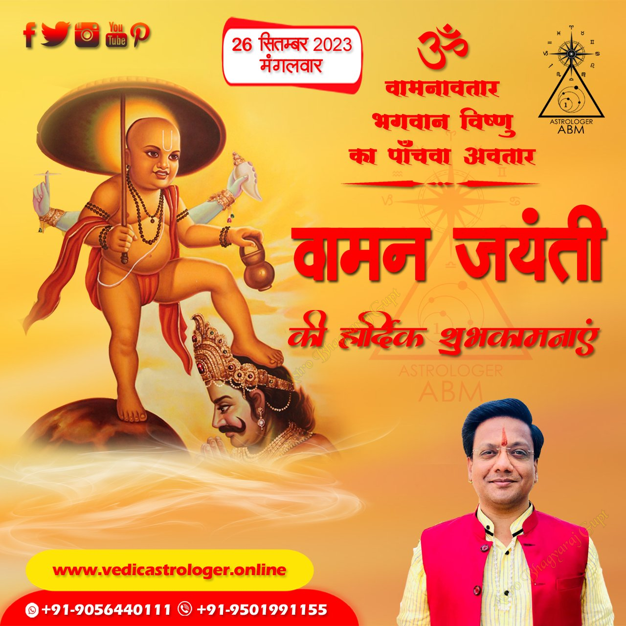 Vaman Jayanti. Astro Bhagyaraj Gupt extends warm wishes to everyone on the auspicious occasion of Vaman Jayanti. This day commemorates the birth of Lord Vishnu's fifth avatar, Vamana, symbolizing humility, devotion, and the triumph of good over ego. May the blessings of Lord Vamana bring prosperity, peace, and spiritual growth to your lives. On this sacred day, let us reflect on the virtues of selflessness and surrender, and strive to embody them in our daily lives. We wish you a blessed Vaman Jayanti.