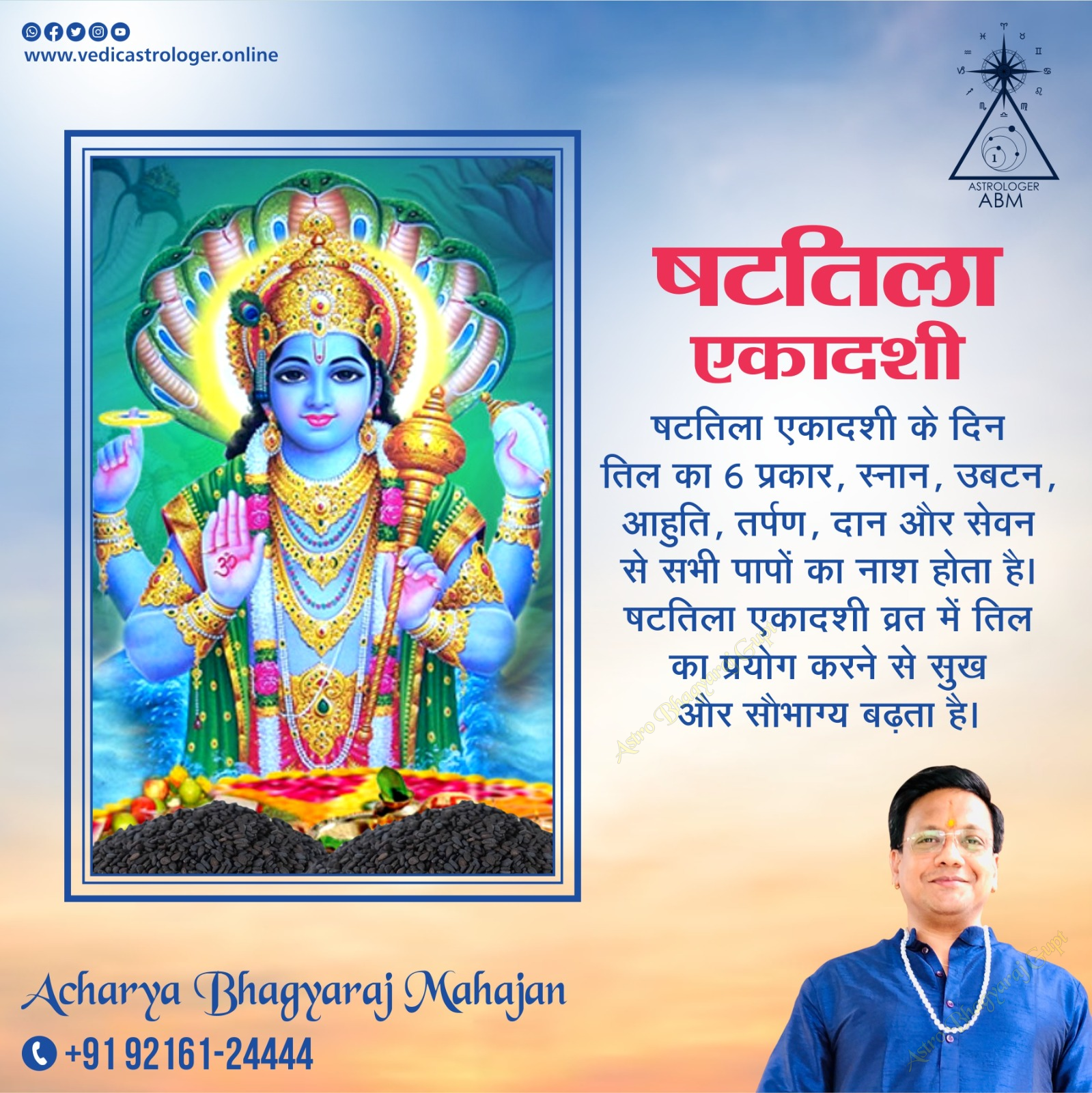 Heartfelt wishes for Shattila Ekadashi from Astrologer Bhagyaraj Gupt. In Hindu scriptures, various remedies and totkas are mentioned for liberation from sins. Especially, the remedies performed on Ekadashi provide salvation. Learn about the very easy and miraculous remedies of sesame seeds on Shattila Ekadashi. Shattila Ekadashi is celebrated on the Ekadashi date of the Krishna Paksha in the month of Magha. It is religiously believed that worshipping Lord Vishnu and fasting on this day brings financial benefits. Using sesame seeds in worship on this day leads to the attainment of knowledge and wealth. Sesame seeds are believed to be the abode of Goddess Mahalakshmi, the goddess of wealth. On this day, Lord Krishna is worshipped by offering fruits, flowers, jaggery, and sweets made of sesame seeds. According to Padma Purana, on this day, one should fast and bathe, donate, offer tarpan (oblations to ancestors), and worship using sesame seeds only. Every year, there are 24 Ekadashi fasts. In the month of Magha, the fast of Shattila Ekadashi will be observed on Tuesday, February 6, 2026. On the day of Shattila Ekadashi, Lord Vishnu is worshipped in his Baikunth form. Special importance of sesame seeds has been mentioned on Shattila Ekadashi. The use of sesame seeds on this day is considered very fruitful. On this day, one should chant the mantra "Om Namo Bhagavate Vasudevaya" as much as possible. Sesame seeds are used in 6 ways on the day of Shattila Ekadashi. Importance of Sesame Seeds on Shattila Ekadashi: On the day of Shattila Ekadashi, all sins are destroyed by using sesame seeds in 6 ways: bathing, applying as a scrub, offering in fire, offering to ancestors, donating, and consuming. It is because of these uses of sesame seeds that this Ekadashi is called Shattila Ekadashi. Using sesame seeds in the Shattila Ekadashi fast increases happiness and good fortune. There is cold in the month of Magha, while sesame seeds have a warm nature, so sesame seeds are also beneficial for health. Using sesame seeds in this fast also keeps one healthy. Uses of Sesame Seeds on Shattila Ekadashi: 1. If you are observing the Shattila Ekadashi fast, then on that day, in the morning, before taking a bath, apply a scrub of sesame seeds on your body. Only then take a bath. With this use of sesame seeds, you will see health-related benefits. 2. Use water mixed with sesame seeds for bathing. For this, fill a bucket with water and add sesame seeds to it. Then take a bath with that water. Doing so maintains happiness and good fortune in your life by the grace of Lord Vishnu. 3. During the worship of the Shattila Ekadashi fast, offer food items made of sesame seeds to Lord Vishnu. By doing so, Lord Vishnu becomes pleased and fulfills desires. Those observing the fast on this day should also include food items made of sesame seeds in their phalahar (light meal). Sesame seeds should also be mixed with drinking water and consumed. 4. A person observing the Shattila Ekadashi fast should massage their body with sesame oil. There is such a religious belief that this use of sesame seeds benefits health. 5. On the day of Shattila Ekadashi, one should perform havan (fire offering) with sesame seeds while worshipping Lord Vishnu. After this, you can perform havan by mixing cow's ghee with sesame seeds. By doing so, Lord Vishnu becomes pleased. 6. It is considered best to donate sesame seeds on the day of Shattila Ekadashi. There is such a belief that donating sesame seeds leads to salvation and a place in heaven.
