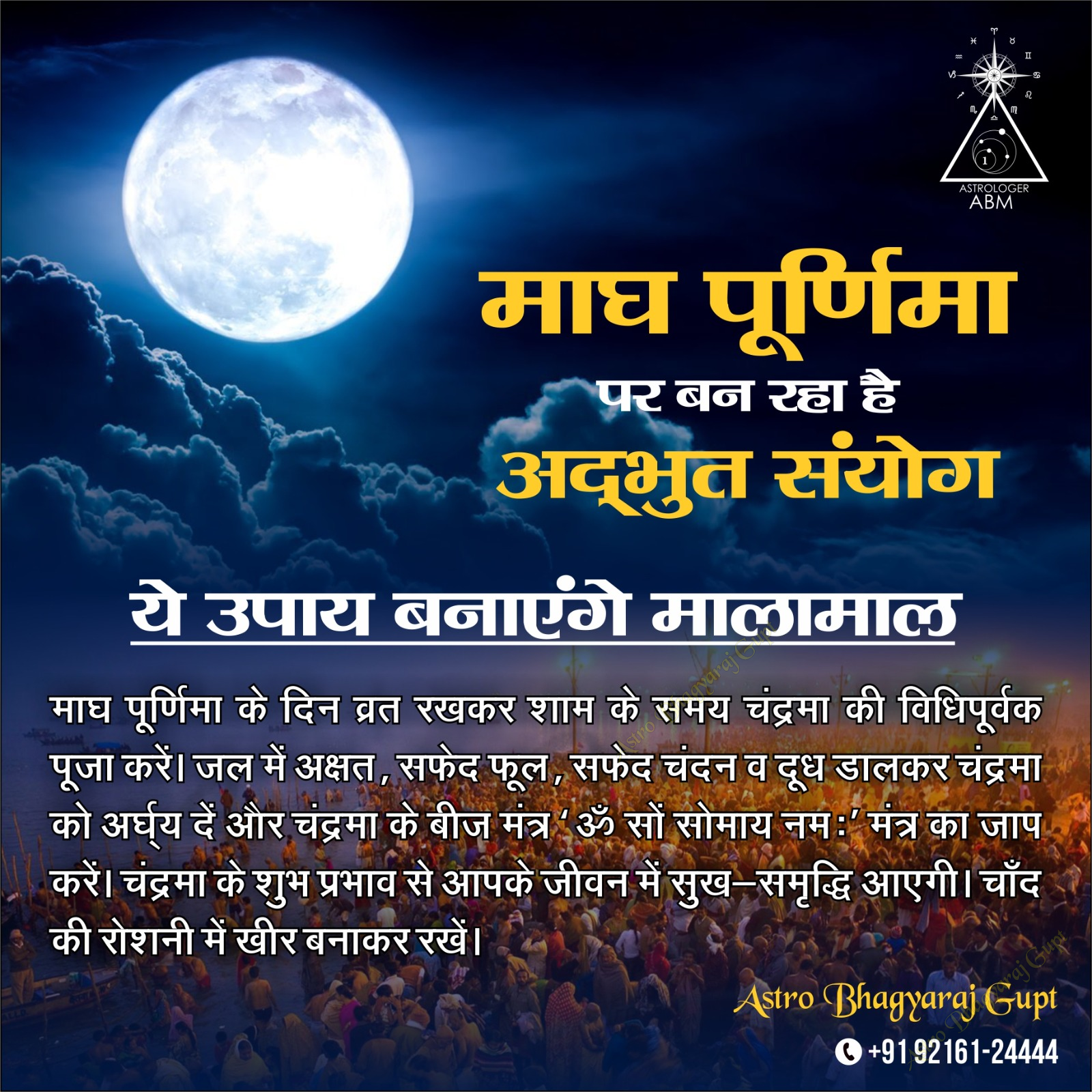 Warmest wishes for Maghi Purnima from Astrologer Bhagyaraj Gupt. Maghi Purnima holds special significance in Hinduism. It is celebrated on the full moon day of the Shukla Paksha in the Magha month. Taking a bath in holy rivers on this day is considered particularly important, and it is believed to wash away all sins and bring merit. Performing acts of charity and virtuous deeds on this day is also considered highly rewarding and brings happiness and prosperity in life. Fairs are organized in many places on this day, and religious stories are recited. Maghi Purnima is considered an extremely auspicious day for spiritual contemplation and religious activities.