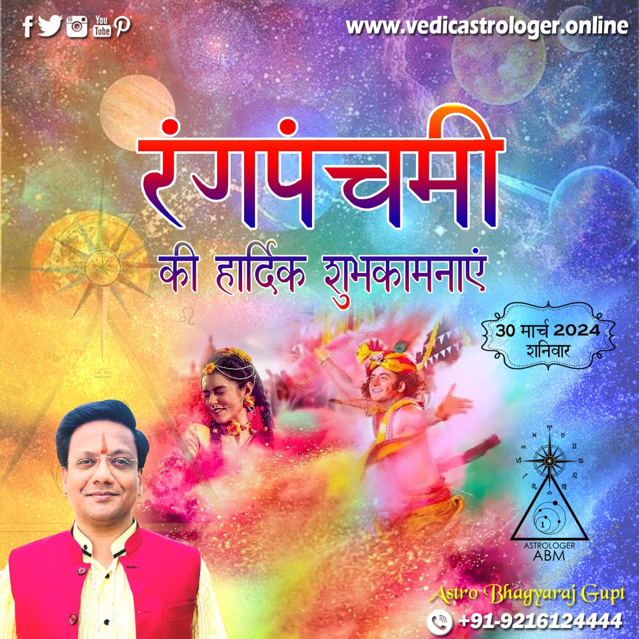 Astrologer Bhagyaraj Gupt extends warm congratulations on the auspicious occasion of Rang Panchami. Rang Panchami, celebrated five days after Holi, holds significant astrological importance. It marks the culmination of the vibrant spring festival and is associated with the purification of the 'Panch Tatva' (five elements). Astrologically, this day is considered auspicious for dispelling negative energies and attracting positive vibrations. The colors thrown on Rang Panchami are believed to activate specific planetary energies, bringing harmony and balance. Many people perform rituals and prayers to strengthen their planetary influences and seek blessings for prosperity and well-being. It is a time to release old burdens and embrace new beginnings, aligning oneself with the cosmic forces of renewal.