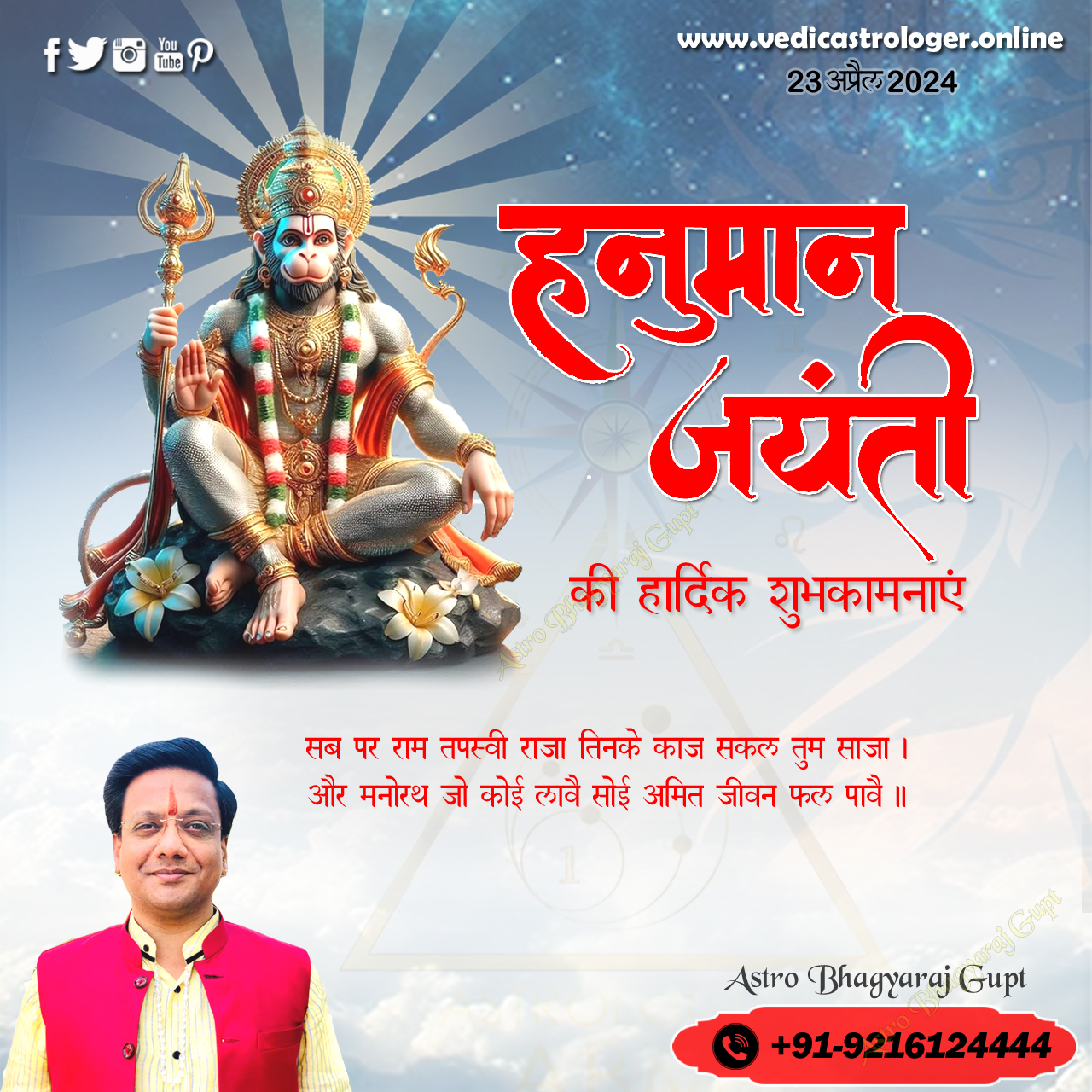 Heartiest greetings for Hanuman Jayanti to all of you from Jyotishacharya Bhagyaraj Gupt. May the grace of Bajrang Bali (Lord Hanuman) bring happiness, peace, and prosperity into all your lives.