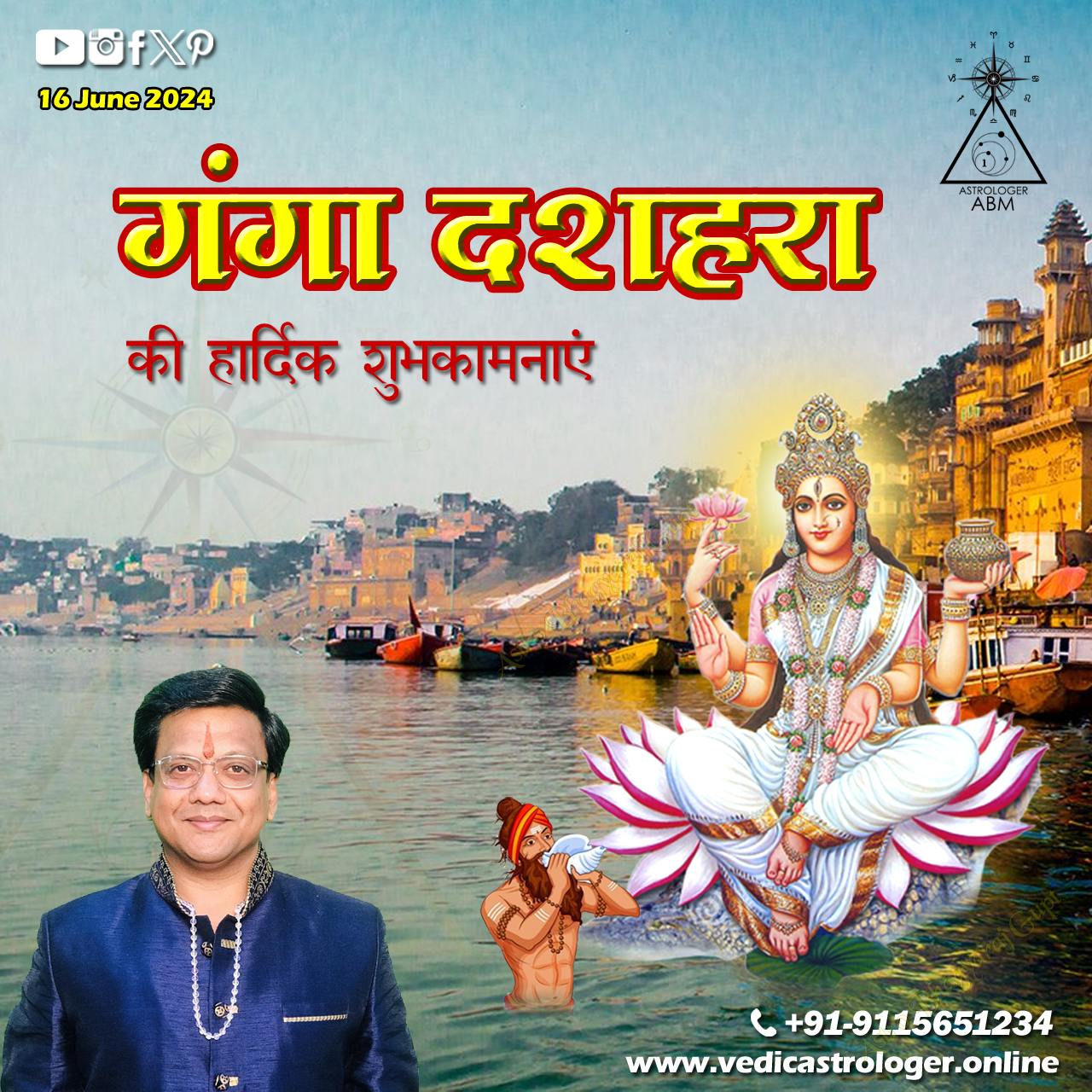 On the auspicious occasion of Ganga Dussehra, the holy birthday of Maa Ganga, Astro Bhagyaraj Gupt, extend heartfelt greetings and best wishes to all of you. Maa Ganga, the symbol of our culture and spirituality, may bring happiness, peace, and prosperity to everyone's life. This sacred festival gives us the opportunity to express our reverence and gratitude towards Maa Ganga. Let us all take a pledge on this day to maintain the cleanliness and conservation of Maa Ganga.