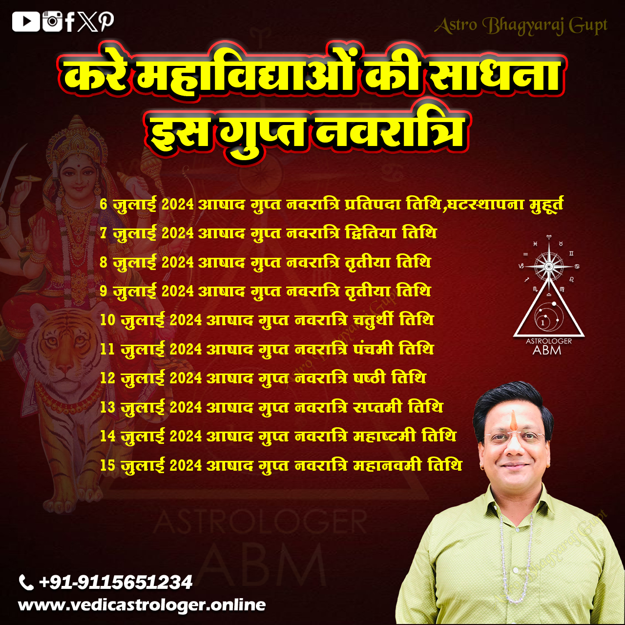 Astrologer Bhagyaraj Gupt wishes you a blessed Gupt Navratri. Gupt Navratri Begins with Rare Yoga Combinations, Know the Auspicious Time for Ghatasthapana, Worship Method, Mantras - According to the Hindu calendar, there are a total of 4 Navratris in a year. Among these, Chaitra and Sharadiya Navratri are celebrated with great pomp across the country. Apart from these, there are two more Navratris, which are called Gupt Navratri (Secret Navratri). These Navratris are considered important for practitioners of Tantra-Mantra. During this time, it is customary to worship the nine forms of Maa Durga along with the 10 Mahavidyas. Gupt Navratri is starting with the Shukla Paksha Tithi of Ashadha month. It is customary to perform Ghatasthapana on this day. Let's know the auspicious time of Gupt Navratri, the time of Ghatasthapana, the method of worship, and mantras. Ashadha Gupt Navratri 2024? (Gupt Navratri 2024 Date) According to the Hindu calendar, Gupt Navratri is starting from Saturday, July 6, 2024, and will end on Monday, July 15, 2024. This year, the Tritiya Tithi will last for two days. Due to this, Gupt Navratri will be for a full 10 days. Along with this, apart from Sarvartha Siddhi Yoga, Tripushkar and Ravi Yoga are also occurring during Navratri. According to the Hindu calendar, the auspicious time for Ghatasthapana of Ashadha Gupt Navratri is from 05:11 AM to 07:26 AM on July 6th. Along with this, Abhijit Muhurta is from 11 AM to 12 PM. Gupt Navratri Puja Vidhi (Gupt Navratri 2024 Puja Vidhi) Wake up early in the morning, take a bath, etc., and wear clean clothes. After this, begin the worship. First, place a picture of Maa Durga on a red cloth spread on a chowki (small stool) or in the temple. Along with this, sow barley by putting some soil in the ground or in an earthen pot. After this, offer water daily until the Navami Tithi. Along with this, establish a Kalash (earthen pot) by putting Gangajal (Ganges water), water, a betel nut, and a coin in it, and then place a bowl filled with grains on top with 5 mango leaves. Place a coconut wrapped in Kalava (sacred thread) on top of it. Now, along with the Kalash, offer flowers, garlands, sindoor (vermilion), akshat (rice grains), etc., to Maa Durga and offer Bhog (food offering). After this, place a clove, cardamom, batasha (sugar candy), and a one-rupee coin in a betel leaf and offer it. After this, light a ghee lamp and incense and recite Maa Durga Chalisa, mantras, Saptashati, and finally perform Aarti. These 10 Mahavidyas will be worshipped in Gupt Navratri. Gupt Navratri is considered best for the practice of Tantra-Mantra. During Gupt Navratri, it is customary to worship the 10 Mahavidyas, which include Maa Kali, Tara, Chinnamasta, Shodashi, Bhuvaneshwari, Tripura Bhairavi, Dhumavati, Bagalamukhi, Matangi, and Kamala Mata. Maa Durga Dhyan Mantra: Om Jata Juta Samayuktamardhendu Krit Lakshanam | Lochanatraya Sanyuktam Padmendusadyashananam || Durga Mantra: Sarvamangalamaangalye Shive Sarvarthasadhike Sharanye Tryambake Gauri Narayani Namostute || Do not make these mistakes even by forgetting: During Gupt Navratri, meat and alcohol should not be consumed at all. During this time, also stay away from onions and garlic; tamasic food creates problems in life. During Gupt Navratri, when you are worshipping the Mother, do not hurt anyone's feelings. Do not use harsh words; in Gupt Navratri, take great care not to sleep during the day, as doing so displeases the Goddess.