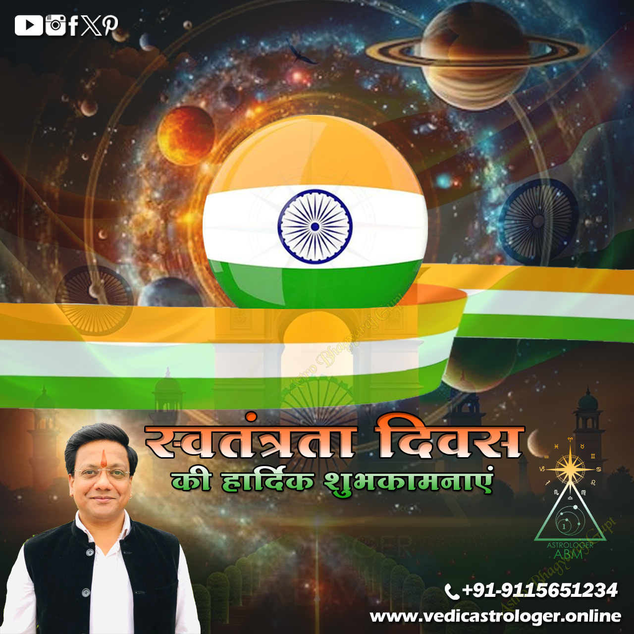 Happy Independence Day from Astrologer Bhagya Raj Gupt On this auspicious occasion of India's Independence Day, I, Astrologer Bhagya Raj Gupt, extend my heartfelt greetings to all of you. May this day fill your lives with joy, prosperity, and a deep sense of patriotism. This is a day to remember the bravehearts who sacrificed their all for the freedom of our nation. We bow in reverence to the courage and sacrifice of Bhagat Singh, Mahatma Gandhi, Subhas Chandra Bose, Sardar Vallabhbhai Patel, Jawaharlal Nehru, and countless other freedom fighters. Independence Day also serves as a reminder that we must continue to work together to make our country even better. We must free our nation from corruption, poverty, and injustice, and build an India that provides equal opportunities for every citizen. May this Independence Day inspire us all to strive for a brighter future for our nation.