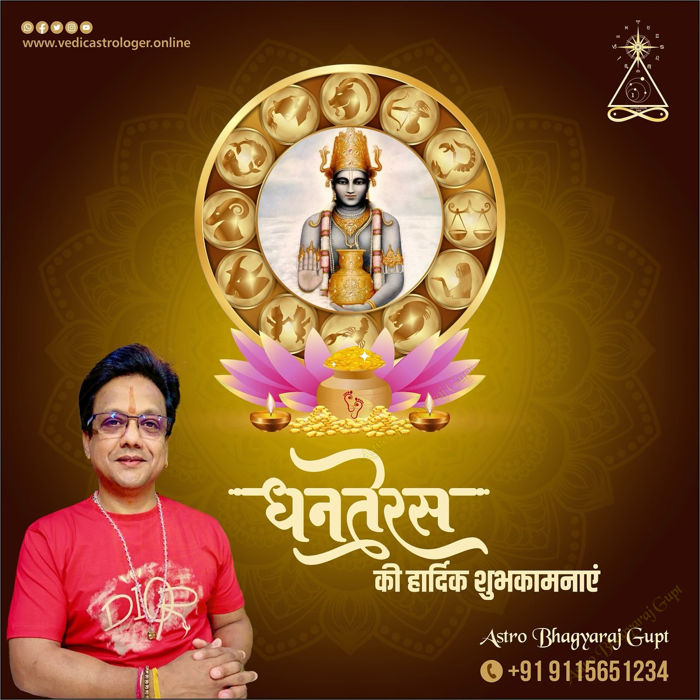 Heartfelt greetings from Jyotishacharya Bhagyaraj Gupt on the auspicious occasion of Lord Dhanvantari's birthday. Lord Dhanvantari, revered as the god of Ayurveda and the physician of the gods, is celebrated on Dhanteras. This day not only highlights the importance of medicine and health but also reminds us to respect nature and the remedies it provides. By worshipping Lord Dhanvantari, we receive the blessings of health and longevity. On the day of Dhanteras, people buy new utensils, gold, silver, and other precious items, which are considered symbols of prosperity and good fortune. This day also inspires us to adopt a healthy lifestyle and take care of our health. It is my wish that we all lead healthy and happy lives with the grace of Lord Dhanvantari.