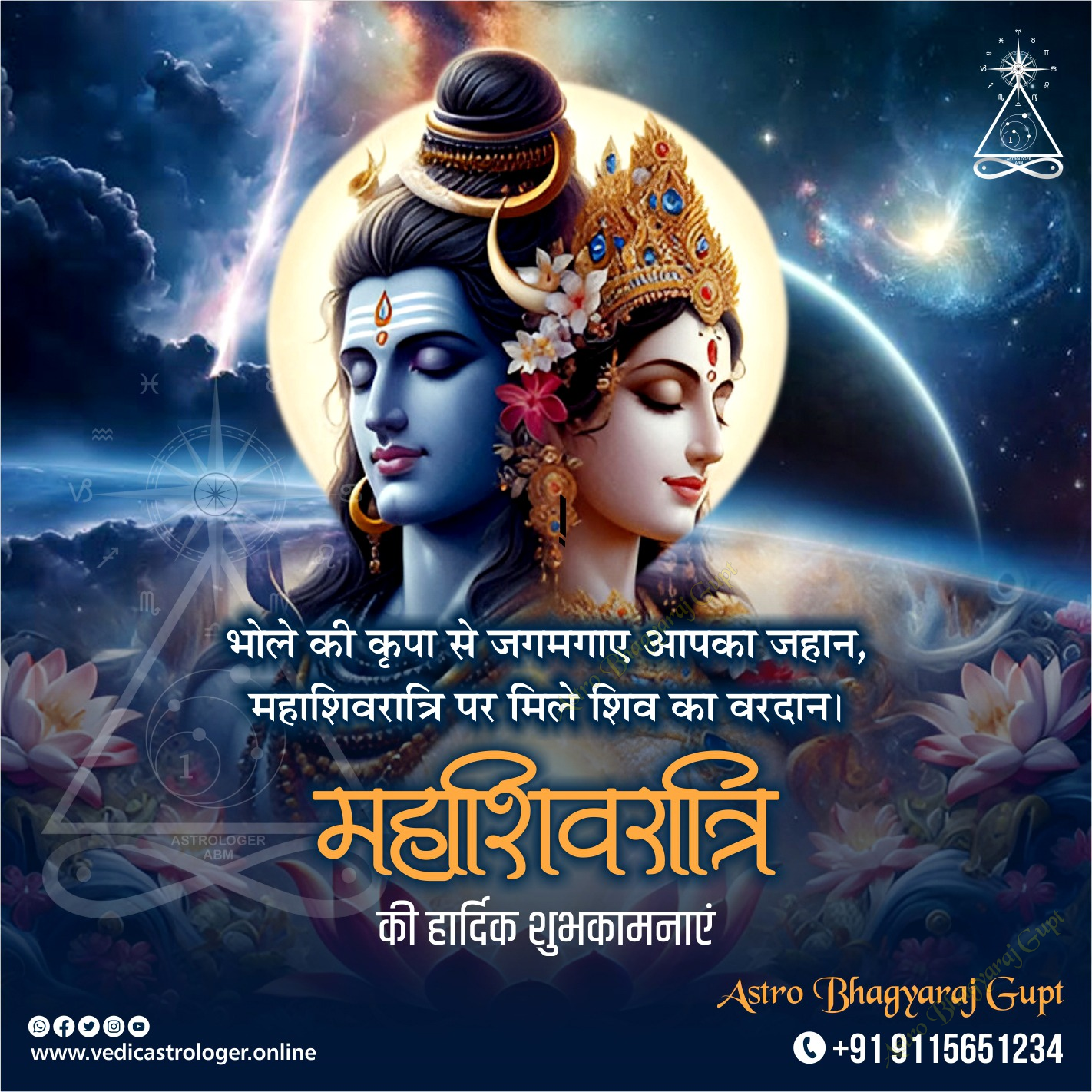 Heartiest greetings for Mahashivratri from Jyotishacharya Bhagyaraj Gupt and Shub Muhurat. This sacred festival symbolizes the divine union of Lord Shiva and Mother Parvati, and on this auspicious day, devotees engage in special prayers and worship to receive Lord Shiva's blessings, particularly through the significant four-phase worship ritual known as the Prahar Puja Vidhi; during the first prahar, the Shivling is bathed with water and offered milk and yogurt while chanting "Om Namah Shivaya"; in the second prahar, it is bathed with honey and ghee, offered fruits and sweets, and the "Om Tryambakam" mantra is recited; the third prahar involves bathing the Shivling with ashes, offering coconut and Panchamrit, and chanting "Om Namah Shivaya"; and finally, the fourth prahar concludes with a Ganga Jal bath, an offering of Bhang and Dhatura, and the continued chanting of "Om Namah Shivaya," each phase holding unique importance in the devotion to Lord Shiva on this holy occasion.