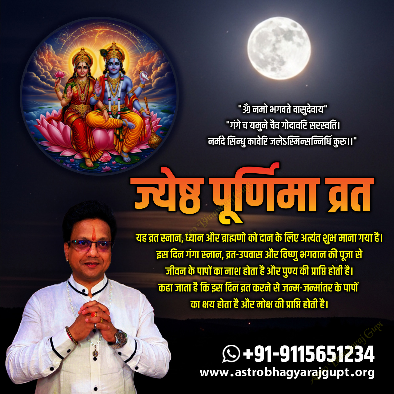 According to Astrologer Astro Bhagyaraj Gupt, Jyeshtha Purnima Vrat, falling on June 11, 2025 (with the Purnima Tithi beginning on June 10, 2025), is a highly significant observance in the Hindu calendar. The image itself visually reinforces the reverence for Lord Vishnu and Goddess Lakshmi, who are central to the worship on this day, as well as the prominence of the full moon. The text in the image further emphasizes the auspiciousness of this Vrat for meditation, charity to Brahmins, and performing Ganga Snan, stating that it leads to the destruction of sins, accumulation of good karma, and ultimately, moksha (salvation) – all key benefits associated with observing this sacred day. For a detailed analysis of this yoga in your horoscope and appropriate astrological remedies, you can contact Astrologer Bhagyaraj Gupt via his website at www.astrobhagyarajgupt.org or by calling +91-9115651234.