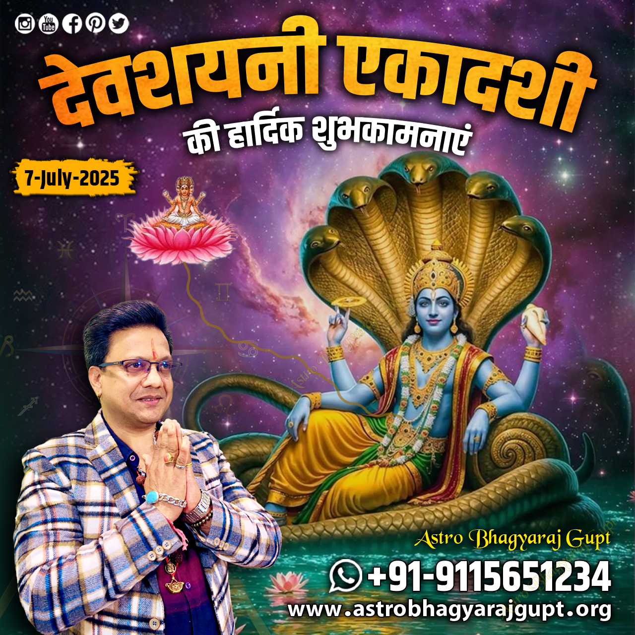 Astrologer Astro Bhagyaraj Gupt wishes everyone a blessed Devshayani Ekadashi, also known as Ashadhi Ekadashi, marks the beginning of Lord Vishnu's resting period. From this day, Lord Vishnu rests in Ksheersagar for four months. This period, known as Chaturmas, is dedicated to spiritual contemplation and penance. Astro Bhagyaraj Gupt extends his best wishes to everyone on this auspicious occasion and prays for Lord Vishnu's blessings to be upon you all. This day provides us with an opportunity for self-reflection and engagement in religious activities. If you want to analyses your horoscope by Astro Bhagyaraj Gupt take appointment click at this link Appointment With Aacharya Ji by Call | आचार्य जी से फ़ोन पर बात करें or You can whatsapp +91 91156 51234 . Om Namho Bhagwate Vasudevaya Namha