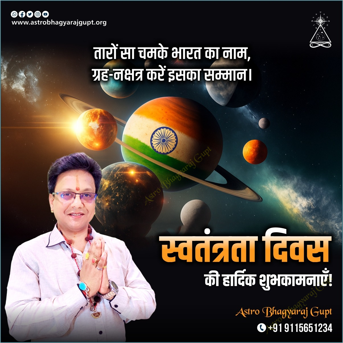 Happy Independence Day Congratulations on the 79th Independence Day from Astrologer Astro Bhagyaraj Gupt. On August 15, 2025, India proudly celebrates its 79th Independence Day, a day that marks a historic turning point in the nation's journey towards freedom and self-governance. This year's theme, "Naya Bharat," reflects India's rapid progress and its ambitious vision to become a developed nation by 2047, commemorating a new era of growth, innovation, and unity. The annual flag-hoisting ceremony at the Red Fort, a beacon of India's glorious past and promising future, will be followed by the address of Honorable Prime Minister Shri Narendra Modi to the nation, where he will outline the achievements and future plans for a strong, prosperous, and united India. you can contact Astrologer Bhagyaraj Gupt by calling or whatsapp at +91-9115651234.