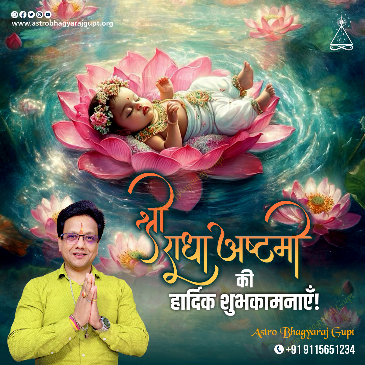 According to Acharya Astro Bhagyaraj Gupt, Radha Ashtami is a deeply significant Hindu festival that celebrates the birth of Goddess Radha, the divine consort of Lord Krishna. As depicted in the image, the festival symbolizes the pure and innocent arrival of Radha Rani, shown as a divine baby resting peacefully on a lotus flower amidst a celestial pond. This visual representation captures the serene and ethereal nature of her birth. Radha Ashtami is celebrated on the eighth day of the bright half of the Bhadrapada month, eight days after Janmashtami. Devotees observe fasts, perform elaborate puja rituals, and sing devotional songs to honor Goddess Radha, believing that her worship brings immense blessings and helps them attain the love and devotion of Lord Krishna. The festival is particularly grand in Braj region, especially in Barsana, Radha's birthplace, where temples are beautifully decorated, and devotees immerse themselves in chants of "Radhe Radhe." If you want to analyses your horoscope by Astro Bhagyaraj Gupt take appointment click at this link Appointment With Aacharya Ji by Call | आचार्य जी से फ़ोन पर बात करें or You can whatsapp +91 91156 51234 . Om Namho Bhagwate Vasudevaya Namha