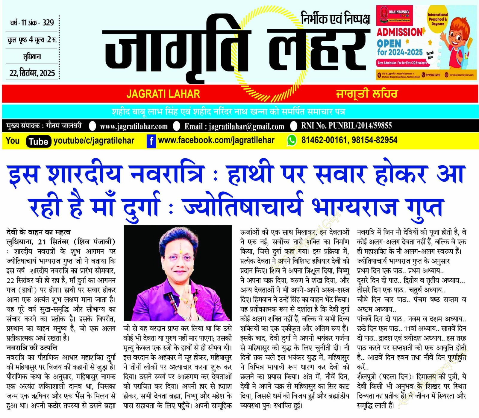 Ludhiana, September 21 (Shiv Punjabi): On the auspicious occasion of Sharad Navratri, Astrologer Bhagyaraj Gupt shared that this year, Sharad Navratri will begin on Monday, September 22. Maa Durga will arrive on an elephant, which is considered an extremely auspicious omen. This arrival on an elephant symbolizes the ushering in of happiness, prosperity, and good fortune for the entire year. In contrast, her departure vehicle is a human, which holds a different symbolic meaning.
