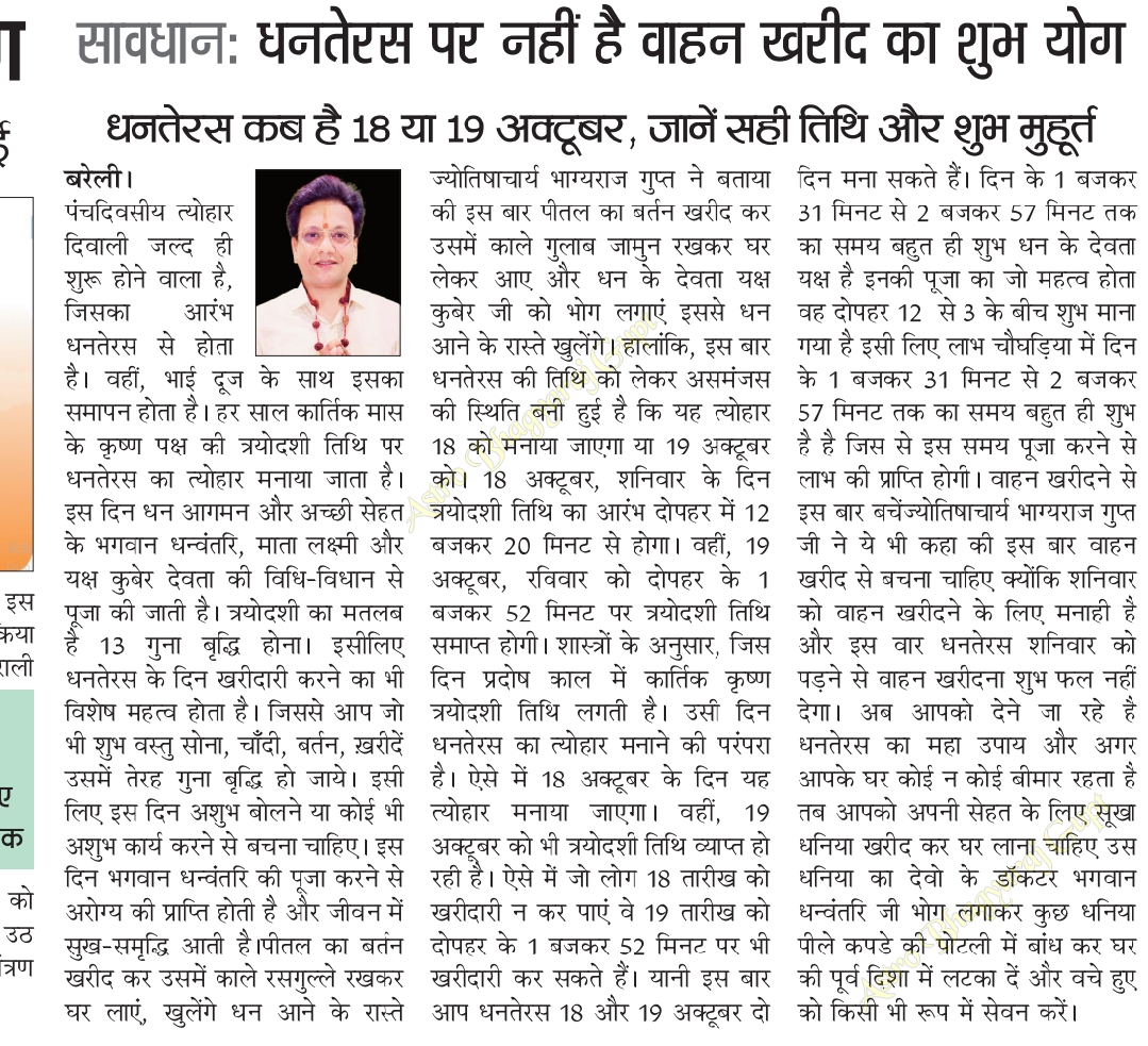 पंचदिवसीय त्योहार दिवाली जल्द ही शुरू होने वाला है, जिसका आरंभ धनतेरस से होता है। वहीं, भाई दूज के साथ इसका समापन होता है। हर साल कार्तिक मास के कृष्ण पक्ष की त्रयोदशी तिथि पर धनतेरस का त्योहार मनाया जाता है। इस दिन धन आगमन और अच्छी सेहत के भगवान धन्वंतरि, माता लक्ष्मी और यक्ष कुबेर देवता की विधि-विधान से पूजा की जाती है। त्रयोदशी का मतलब है १३ गुना बृद्धि होना इसी लिए धनतेरस के दिन खरीदारी करने का भी विशेष महत्व होता है। जिस से आप जो भी शुभ वास्तु सोना, चाँदी, बर्तन, ख़रीदे उसमे तेरह गुना बृद्धि हो जाये इसी लिए इस दिन अशुभ बोलने या कोई भी अशुभ कार्य करने से बचना चाहि। इस दिन भगवान धन्वंतरि की पूजा करने से अरोग्य की प्राप्ति होती है और जीवन में सुख-समृद्धि आती है। ज्योतिषाचार्य भाग्यराज गुप्त जी ( ASTRO Bhagyaraj Gupt ) ने बताया की इस बार पीतल का बर्तन खरीद कर उसमे काले गुलाब जामुन रखकर घर लेकर आए और धन के देवता यक्ष कुबेर जी को भोग लगाए इस से धन आने के रास्ते खुलेंगे।
