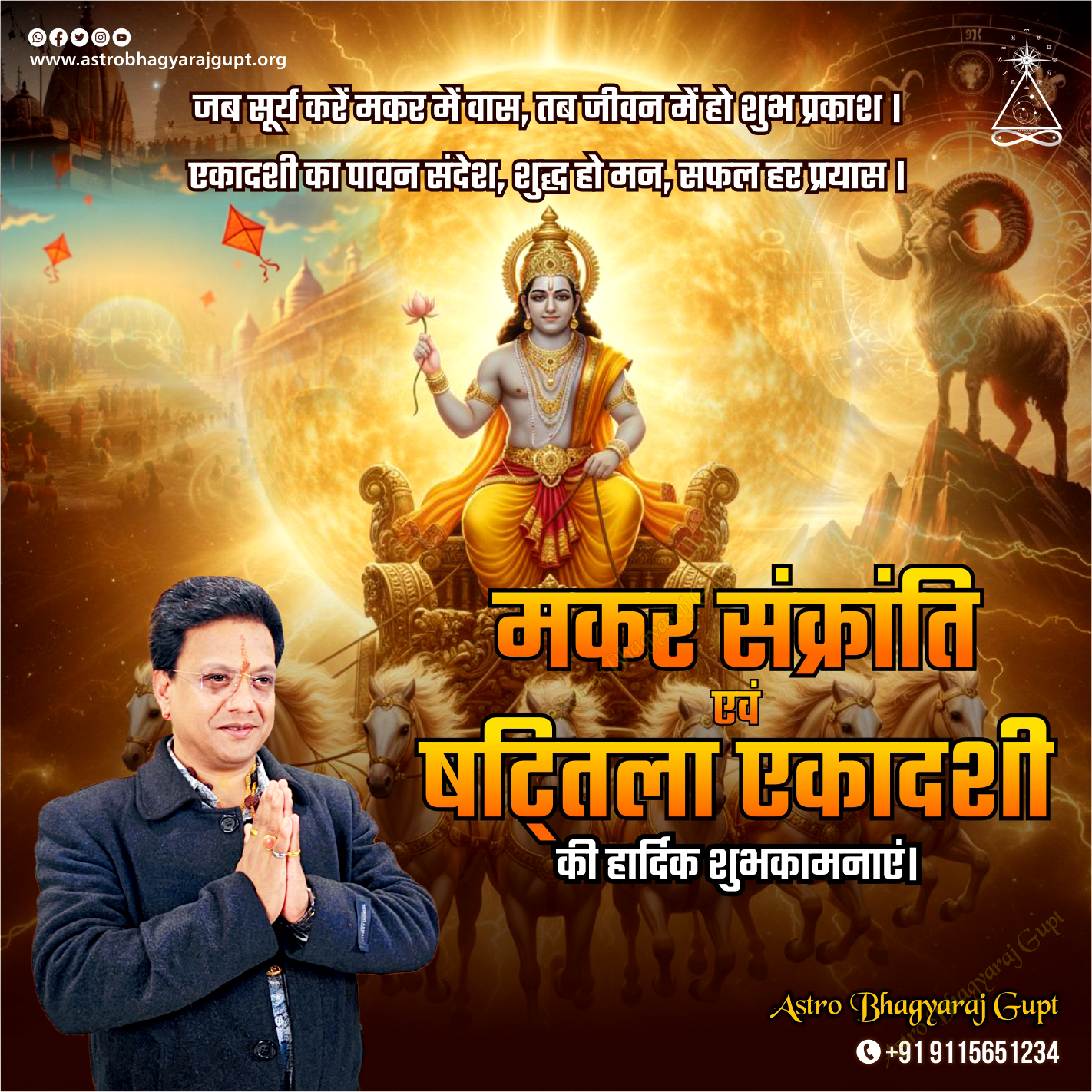 When Lord Surya enters the zodiac sign of Capricorn, it brings a flow of positive energy, auspiciousness, and new light into life. The sacred festival of Makar Sankranti symbolizes hard work, discipline, and fresh resolutions, while Shattila Ekadashi offers a unique opportunity for self-purification, restraint, and devotion. This special spiritual combination encourages fasting, charity, holy bathing, and worship of the Sun God, which purifies the mind and helps one succeed in life’s endeavors. This divine period inspires us to cleanse our actions, let go of negativity, and move forward on the path of righteousness and truth.